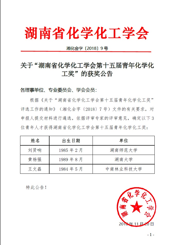 据悉,湖南省化学化工学会青年化学化工奖设立于1989年,是学会设立最早的学术奖励,旨在促进我省化学化工事业的发展,充分发挥科技人才在推进自主创新中的重要作用,培养、造就更多的青年化学化工方面科技创新人才和科学普及带头人,激励广大青年化学化工科技工作者为建设创新型湖南做出新的贡献。该奖每2年评选一次,每次评选不超过5人,评选对象为35周岁以下且在湖南省工作的学会会员。