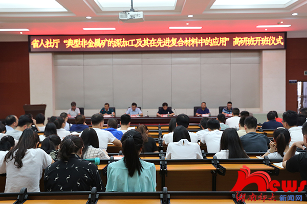 本网讯(记者 徐诗雅 李文) 6月12日上午,省人社厅“典型非金属矿的深加工及其在先进复合材料中的应用”高级研修班开班仪式在我校化学化工学院新楼报告厅举行。省人力资源和社会保障厅专技处副处长李谦、中国非金属矿工业协会专职副会长兼秘书长王文利等出席开班仪式。仪式由化工院党委书记于风江主持。