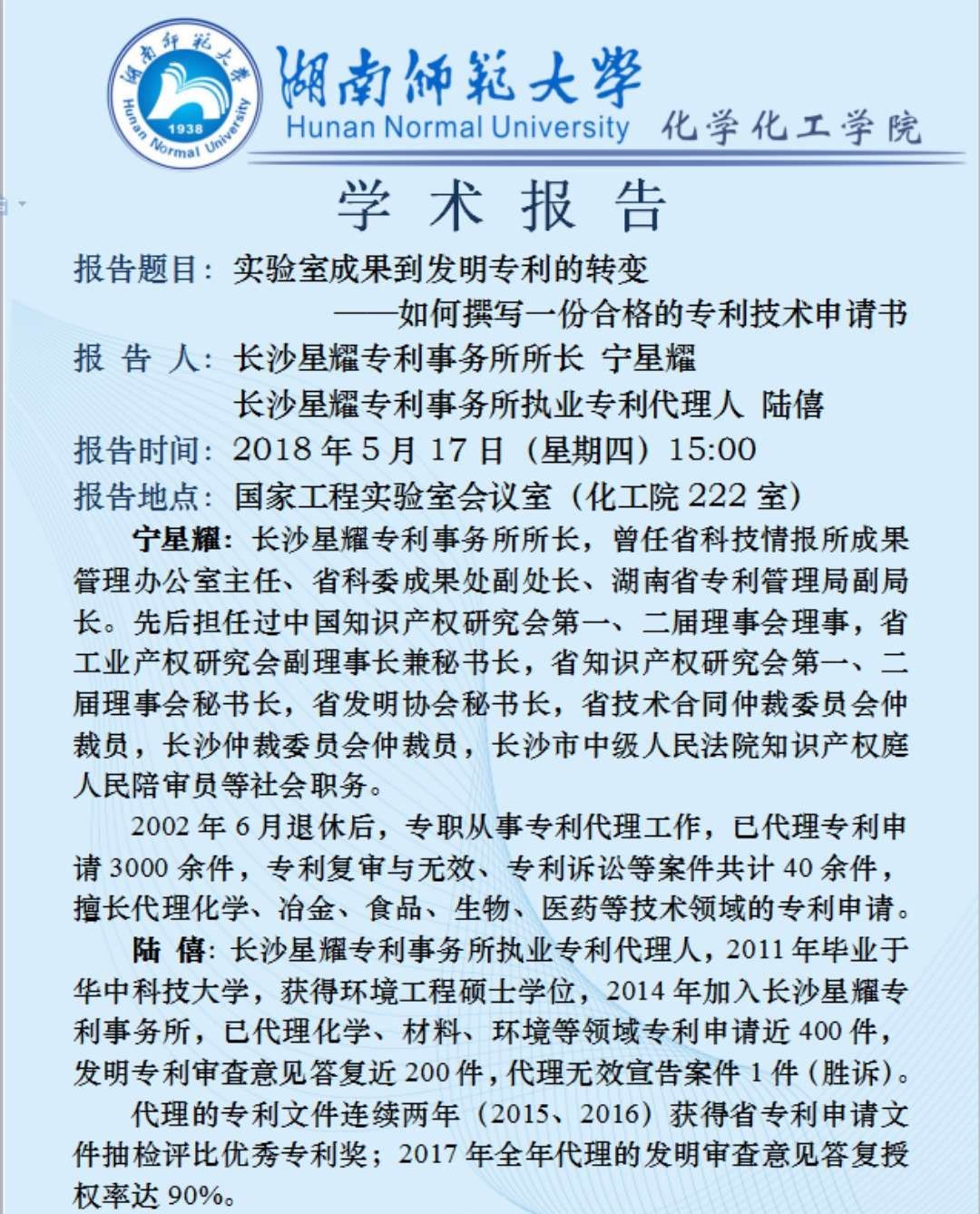 本网讯 2018年5月17日下午,为提高发明专利的申请质量和授权率,石化新材料与资源精细利用国家地方联合工程实验室邀请了长沙星耀专利事务所所长宁星耀及专利代理人陆僖作专利申请相关的专题培训。专利代理人分别从专利基础知识、技术交底材料的准备、专利布局及具体的案例等方面进行了详细地介绍,并对与会师生提出的疑问进行了解答。