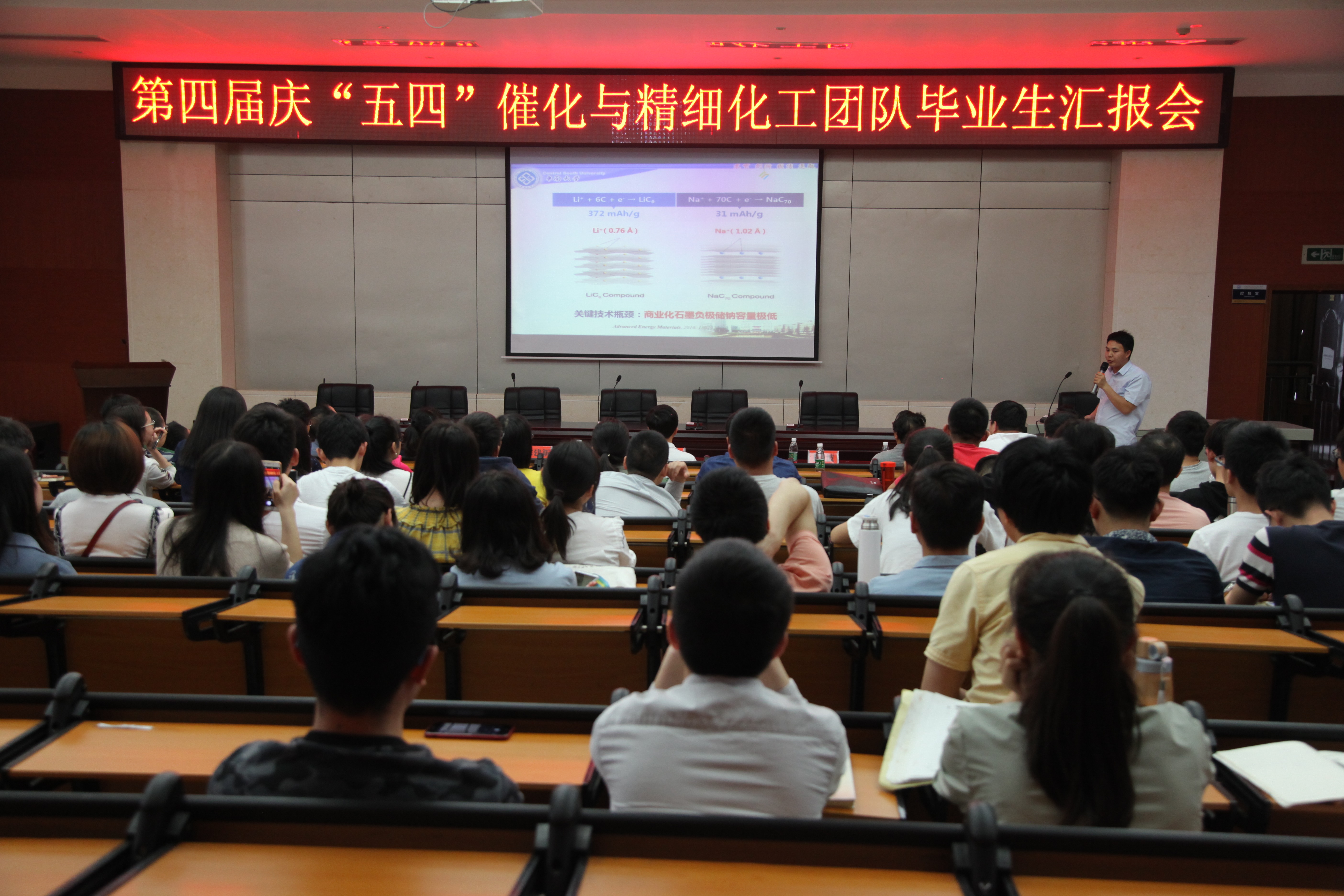 2018届6位优秀毕业研究生代表汇报了研究生期间所做的工作。汤森培博士、张瑶瑶博士、杨恩博、高梦翘、刘林、杨剑分别作了“碳氢化合物绿色催化选择氧化的研究”、“仿生纳米反应器的可控构筑及其应用于水相不对称催化反应”、“多孔炭材料制备与选择性吸附脱硫”、“光/温敏自组装纳米反应器实时调控水相中硫醚不对称氧化反应”、“反应型聚氨酯热熔胶的制备及生产工艺研究”、“无金属二氧化硅催化环己胺制环己酮肟孔道效应和炭物种研究”报告。2015届优秀硕士毕业生邹国强(2018年获中南大学博士学位)分享科研经验并作“MOF衍生碳基材料在钠离子电池中的应用研究”报告。