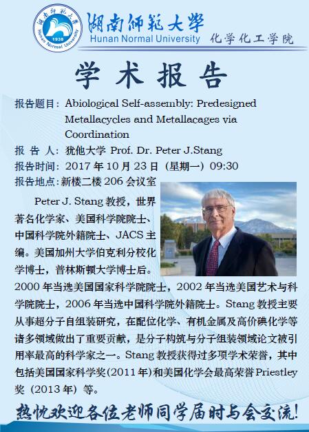 Peter J. Stang教授,世界著名化学家、美国科学院院士、中国科学院外籍院士、JACS主编。美国加州大学伯克利分校化学博士,普林斯顿大学博士后。2000年当选美国国家科学院院士,2002年当选美国艺术与科学院院士,2006年当选中国科学院外籍院士。Stang教授主要从事超分子自组装研究,在配位化学、有机金属及高价碘化学等诸多领域做出了重要贡献,是分子构筑与分子组装领域论文被引用率最高的科学家之一。Stang教授获得过多项学术荣誉,其中包括美国国家科学奖(2011年)和美国化学会最高荣誉Priestley奖(2013年)等。