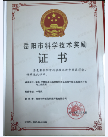 本网讯 石化新材料与资源精细利用国家地方联合工程实验室“苯酚-甲醇烷基化选择性制高品质邻甲酚工艺技术开发与工业应用”项目获2016年度岳阳市科技进步一等奖,中国石化集团资产经营管理有限公司巴陵石化分公司首席专家教授级高级工程师梁红文颁奖,湖南长岭石化科技开发有限公司董事长兼总经理佘喜春作为获奖代表发言。