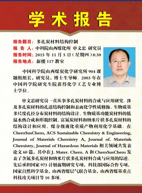 本网讯 11月5日,中科院山西煤化所申文忠研究员访问石化新材料与资源精细利用国家地方联合工程实验室,并作了题为“多孔碳材料结构控制”的学术报告。