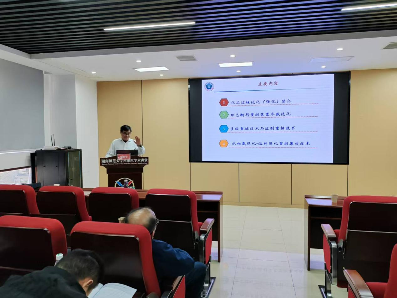 11月30日,著名的化学工程专家、湘潭大学原校长罗和安教授再次来到实验室指导工作,并为全省“现代石化中的催化科技创新”高级研修班和部分师生,作专题报告——环己酮氨肟化及重排的催化过程强化的工程化创新。