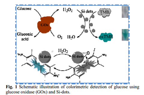 传统量子点常用于荧光检测,并由于含重金属元素而极大地限制了其在生物领域的应用。硅点(Si-dots)作为一种具有良好生物兼容性的材料,广泛的应用于各个领域。本文探讨的是除了Si-dots荧光性能外的一个新的性质,即Si-dots具有类HRP酶的性质,并成功应用于检测血糖含量(见上图)。所合成的Si-dot性质稳定,易保存,且联立Si-dots和葡萄糖氧化酶构建的传感器具有高选择和高灵敏的特征。这个性能的发现极大地拓宽了Si量子点的应用。